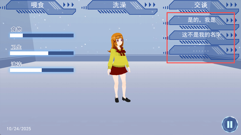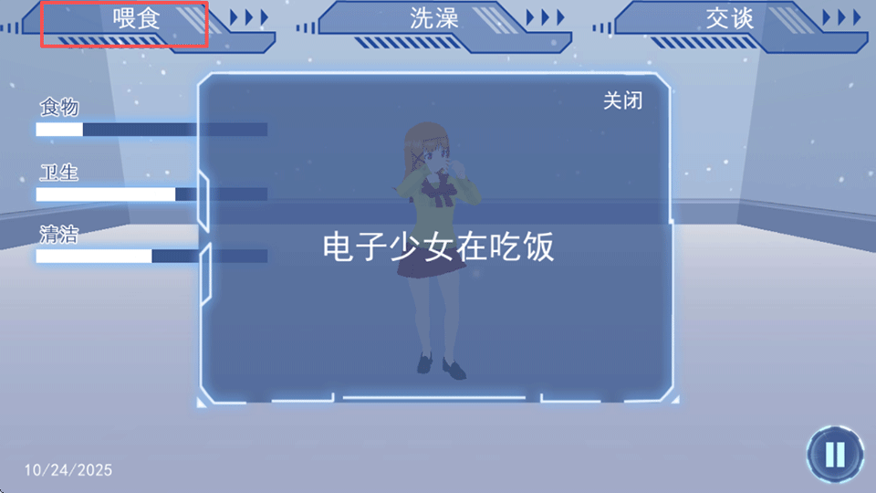 3、当她感到饥饿时,点击左上角的“食物”图标,为她投喂食物,补充能量并提升饱食度。
