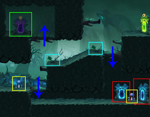 注意事项:有1棵毒蘑菇和1棵捕蝇草。下方概率出现1棵食人花。两个红框位置随机出现1-2个蓝门,下方绿框内概率出现箱子或幻兽其中之一,中部绿框概率出现紫门。