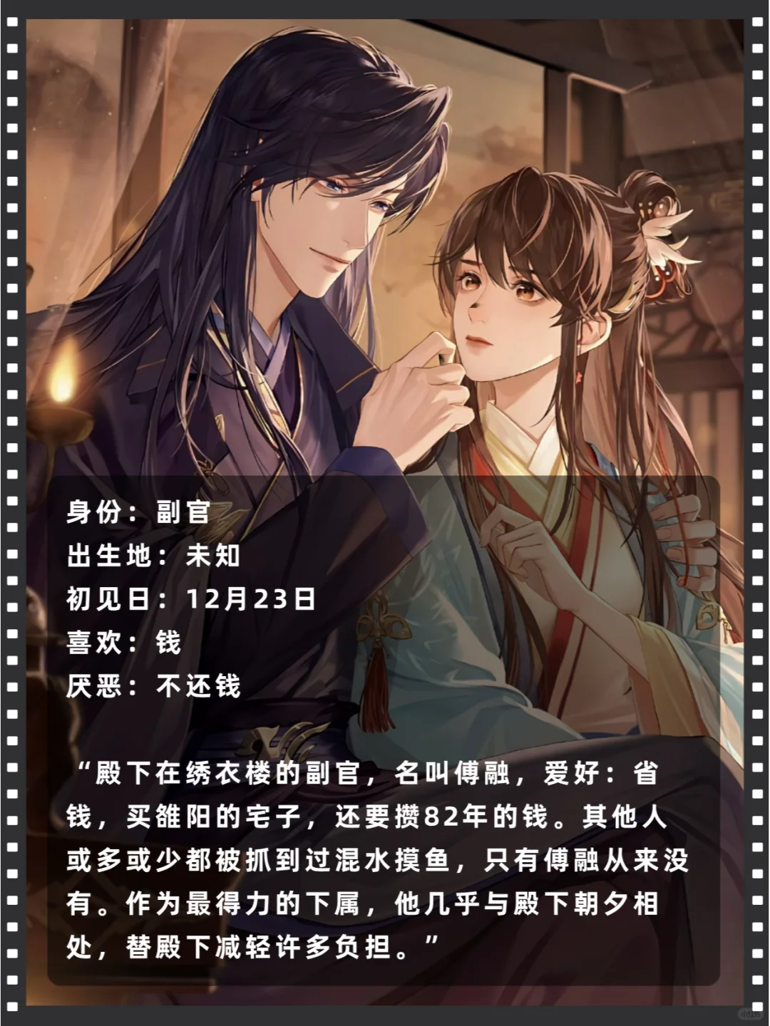 与颜良同期加入绣衣楼。率领“蜉蝣军”屡创奇功,作战风格毫不惜命,阴狠轻生。须留意其忠诚度表现。每次谈到过往的时候都会回避,到底发生了什么?