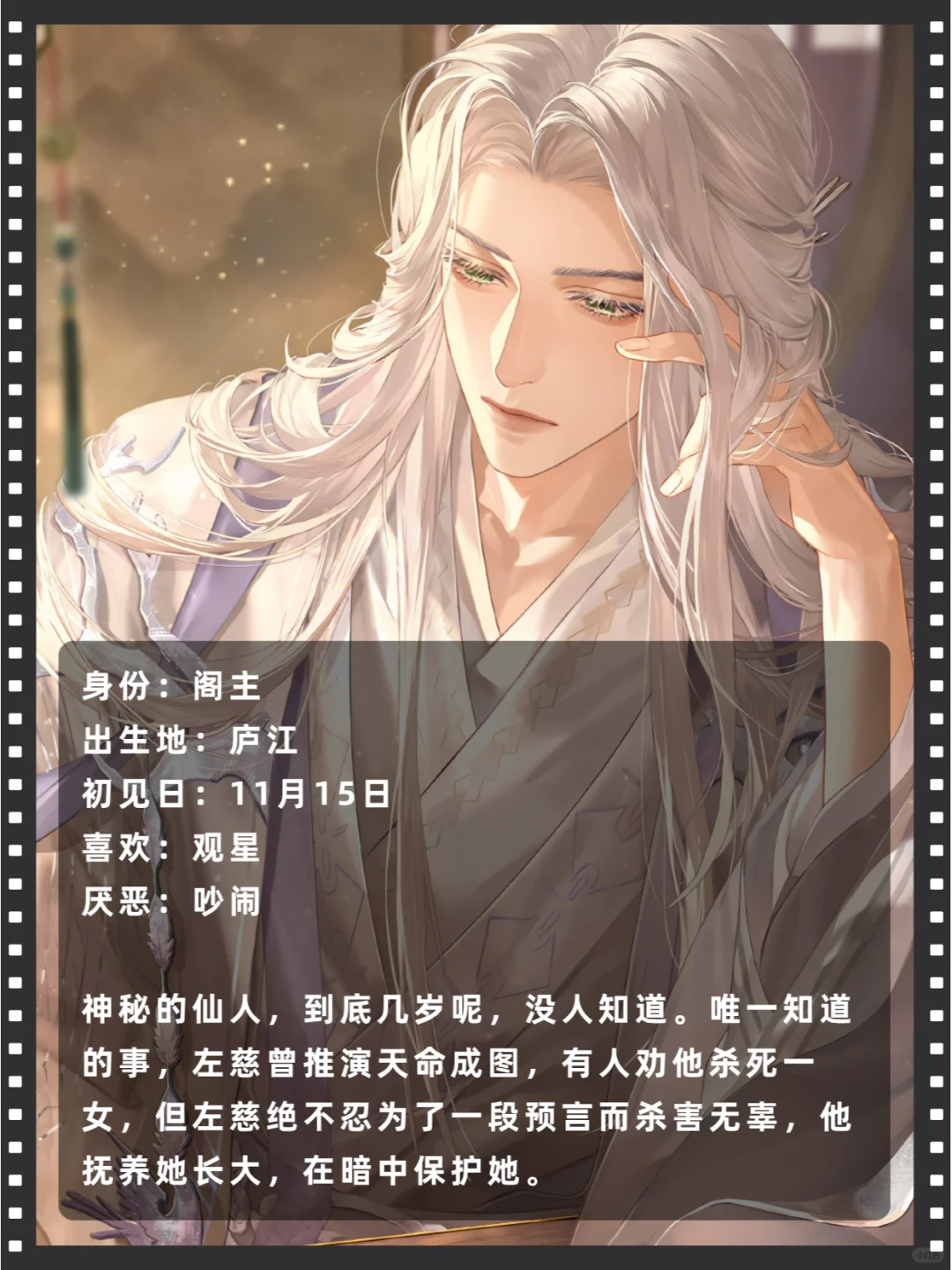 出身于名门士族,但家族因为伤寒一夕覆灭。后进入隐鸢阁,成为史上最年轻的翳部首座。有严重的洁癖和强迫症,到底是心理阴影还是职业习惯?