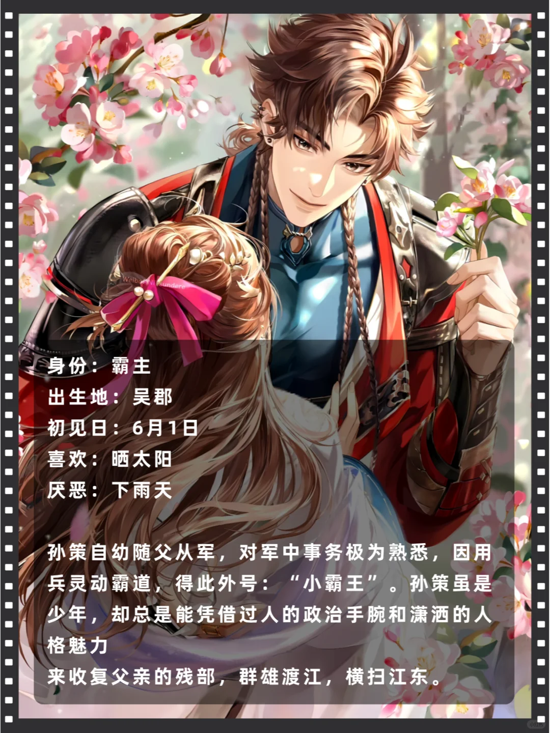 出身于徐州的官宦世家。虽是世家长子,比起坐在书卷前,更喜欢闲步于田埂间。曾多次不顾华佗禁令生食鱼脍,真是令人担忧的饮食习惯。