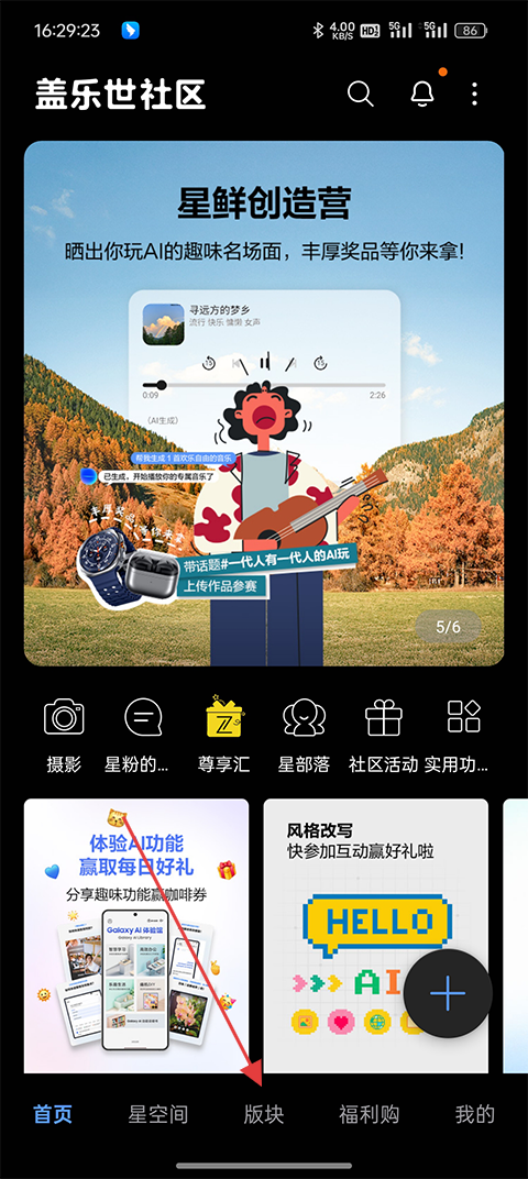 1、打开盖乐世社区App,在底部菜单中点击“板块”功能入口。