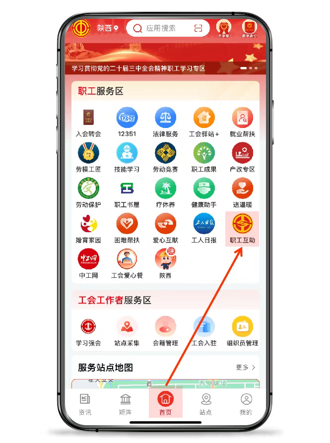 1、登录软件之后,点击首页“职工互助”图标后,点击“陕西“图标;