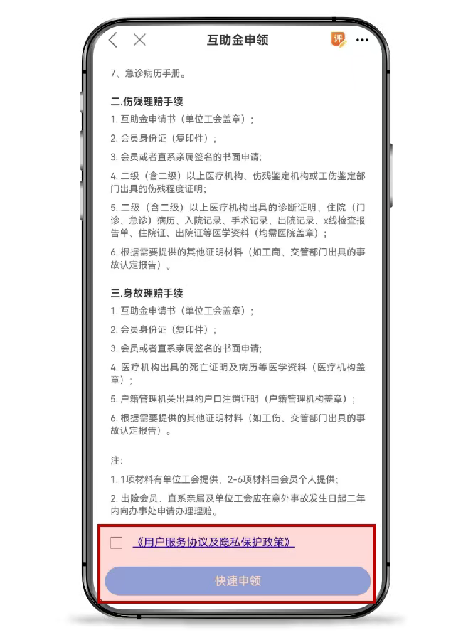 3、进入到申领页面后,详细了解申领材料信息,下拉至页面末;勾选《用户服务协议及隐私保护政策》,点击快速申领;