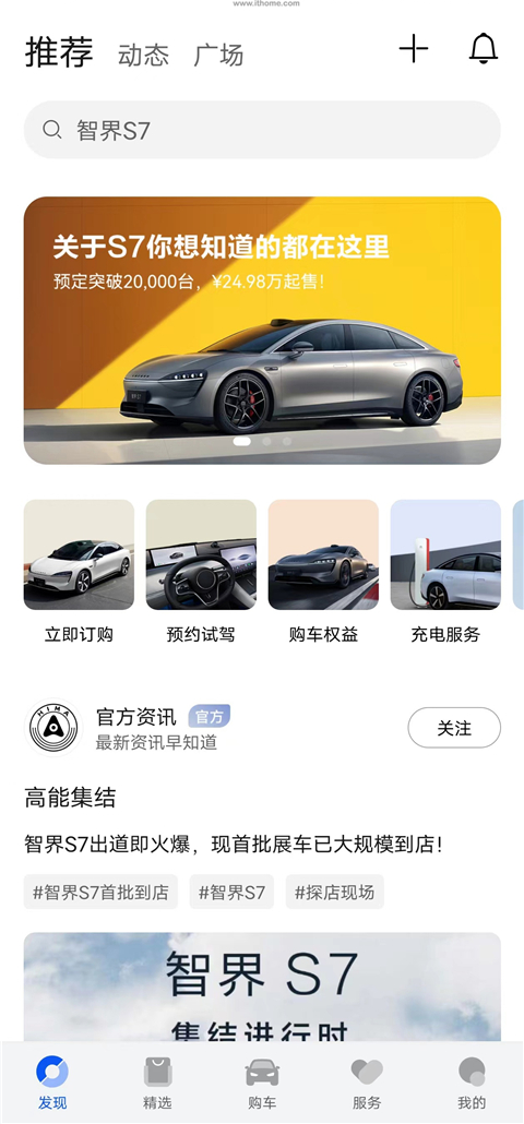 3、购车版块可以预约试驾、订购车辆,目前仅有智界 S7,还提供专属购车顾问电话;