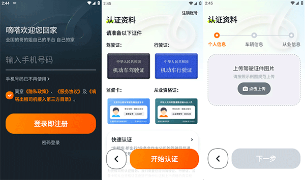 打开嘀嗒出租司机端,输入手机号或账号进行登录,登录成功后点击开始认证,依据操作指示上传个人信息、车辆信息以及从业信息等材料,等待审核即可:
