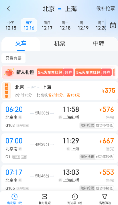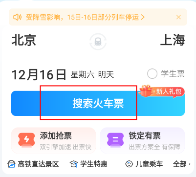 高铁管家手机版是一款超级不错的铁路出行服务软件,通过使用它不仅可以让你随时随地安心预订车票,还可以实时查询高铁票信息,让你无论是订票、改签还是退票都可以为你带来快捷的服务体验,而且这里的票源都是正规可靠的,无需支付手续费,即可随时在线操作,同时,你还可以随时关注列车的时刻表和余票查询功能,让你实时掌握出行的信息,感兴趣的话,不妨来下载试试吧。1、打开高铁管家,输入行程的起点跟终点站,选择购票的日期,点击搜索火车票按钮。