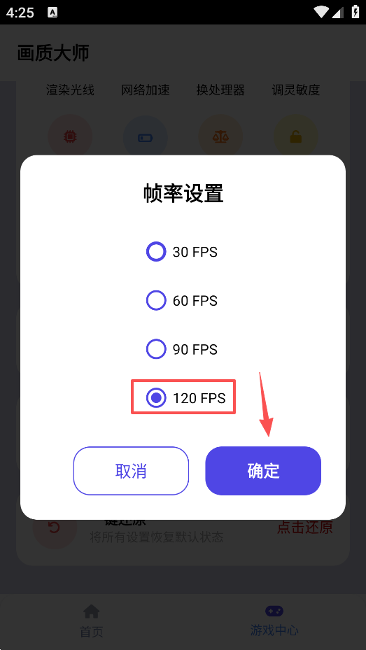2、在打开的帧率设置页勾选【120FPS】,点击【确定】即可。