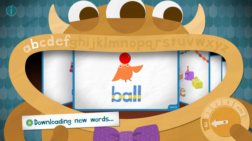 1、打开软件,会出现了一个张着大嘴的萌系大怪物,大怪物的大嘴巴里面就是小朋友们要学习的英文单词啦,只需要小朋友们点击自己想要学习的单词就可以了。