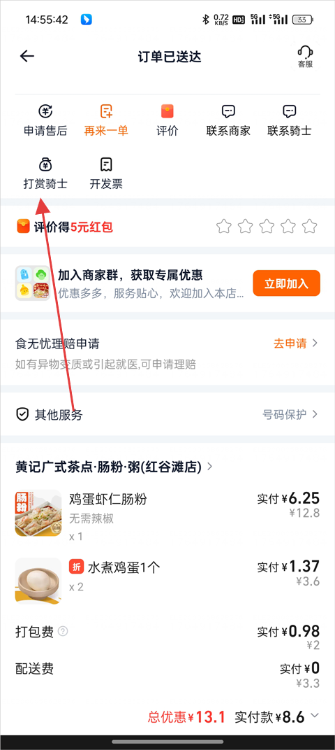 3、找到想要打赏骑手的那笔订单并进入详情页。