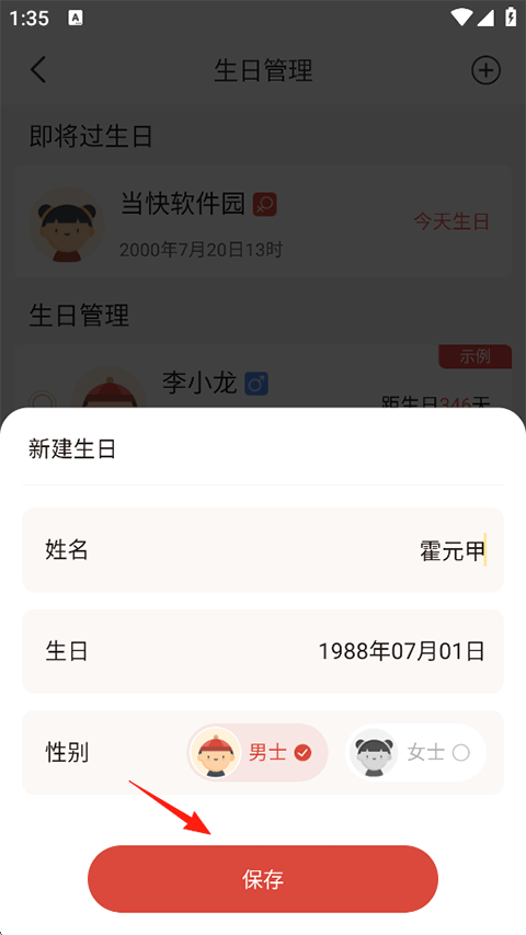 4、填写个人信息如:姓名、生日以及性别,完成后点击保存;