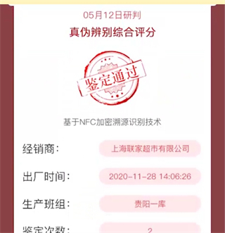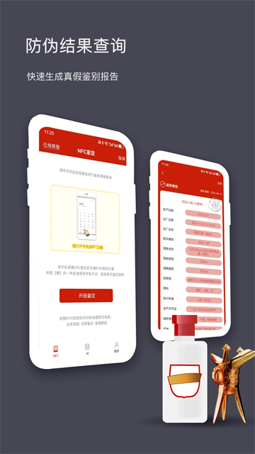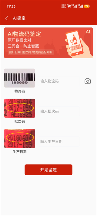 打开国酒NFC防伪溯源-点击AI鉴定-输入物流码-输入批次码-输入生产日期-点击开始鉴定-显示查询结果