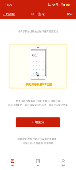 1、首先请打开手机的NFC功能,点击开始鉴定