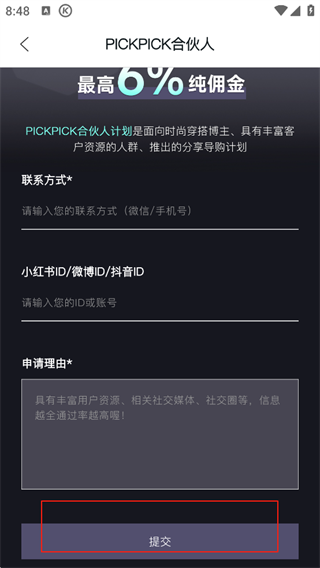 2、输入联系方式、小红书ID、 微博 ID、抖音ID,最后写一个申请理由点击提交