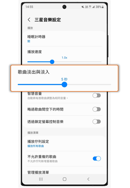 三星音乐提供淡入淡出功能,避免歌曲之间太过于安静,让您可以完全融入音乐的世界