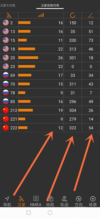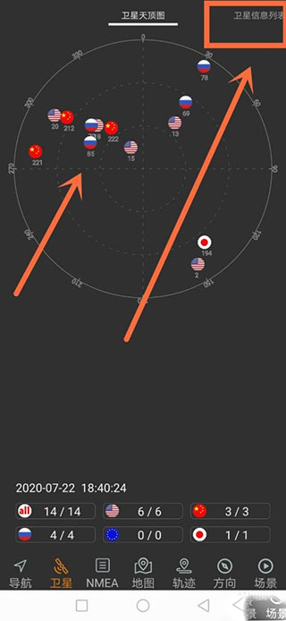 4、待显示好卫星数量后,点击右上角的【卫星信息列表】进入。如下图所示