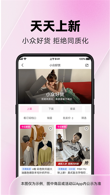 平台直连广州十三行、沙河、UUS、白马以及杭州四季青、韩国东大门等一级批发市场,10年买手团队每日精选1000+新款,提前锁定流行风向 。