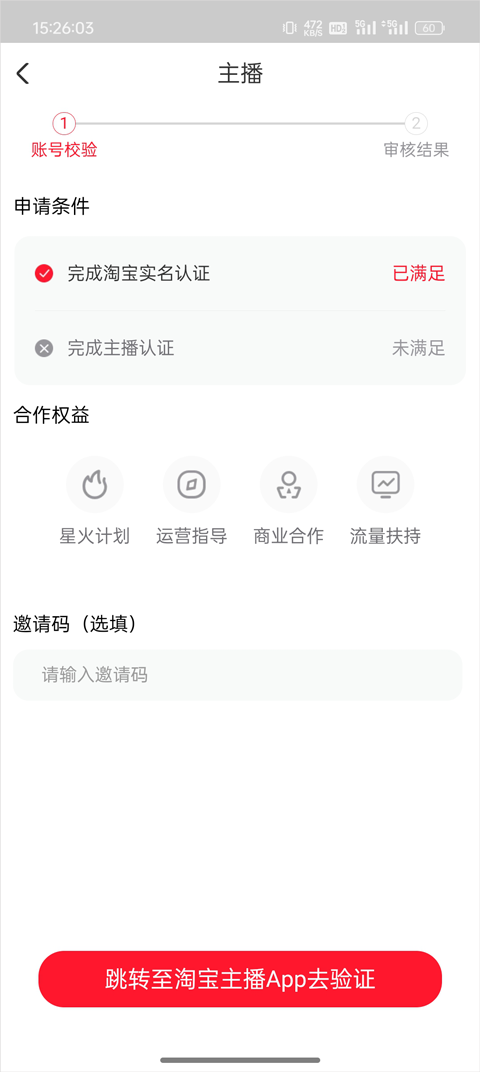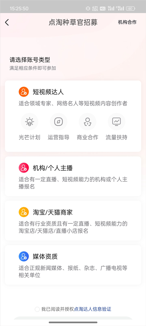 3、选择账号类型,满足相应条件即可参与,点击主播并加入,适合有一定 短视频 创作和直播能力的主播;