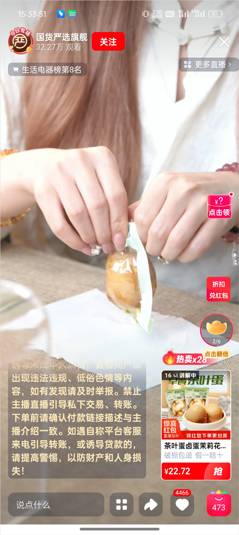 进入直播间后,就可以看到,主播正在带货,左下角还可以看到很多评论,(这里顺便给大家分享一个小技巧,如果你感觉直播间的信息太多的,看的烦,你只想单纯的看主播的直播内容,这时,可以点击一下屏幕中间,即可一键清屏,告别烦恼的弹幕,效果如下)回到正题,我们需要点击左上角“主播头像”图标,下方会弹出一个界面,再次点击“主播头像”,即可进入主页。