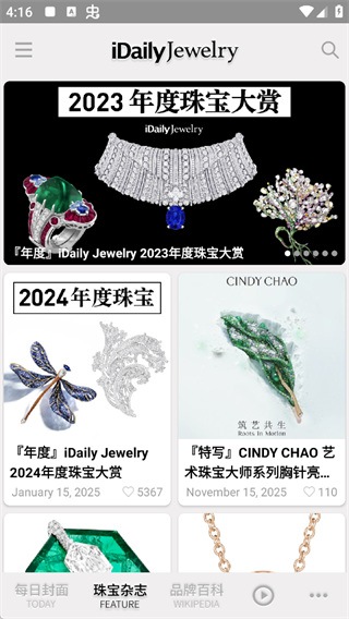 1、进入每日珠宝杂志App后,可查看珠宝杂志浏览珠宝大赏、大牌特写等多元内容,第一时间获取全球珠宝资讯与精品赏析。
