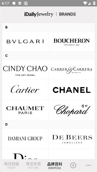 3、点击品牌百科即可查看按字母顺序排列的全球珠宝品牌列表,方便快速定位并查找心仪品牌。