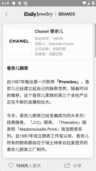 4、进入品牌详情页后,可查看创立时间、创始人、总部等基础信息,并阅读品牌历史与发展脉络,全面了解其珠宝产品线与设计特色。