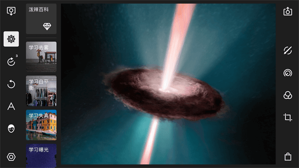 在引导教程面板下,一共包括了泼辣百科、学习去雾、学习白平衡、学习失真、学习曝光、学习全局调整、学习圆形调整、学习渐变调整、学习选色调整、学习笔刷、开始使用、键盘快捷键十二个选项。