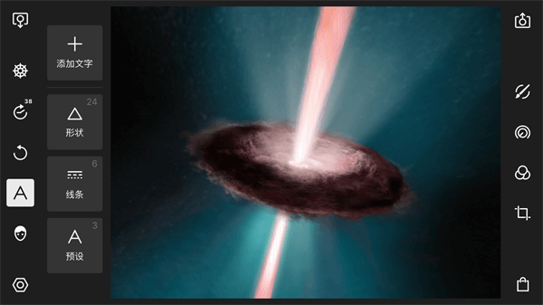 利用文字功能我们可以为照片加入文字。该功能下一共包括四个调整选项:添加文字、形状、线条、预设。