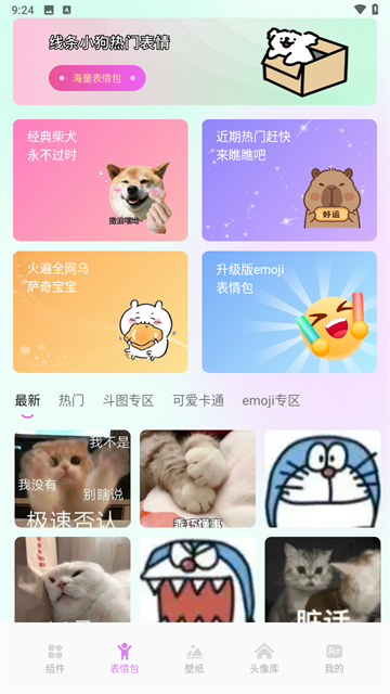 4、在表情包板块,可第一时间获取诸多热门和最新的表情包,并能自由下载;