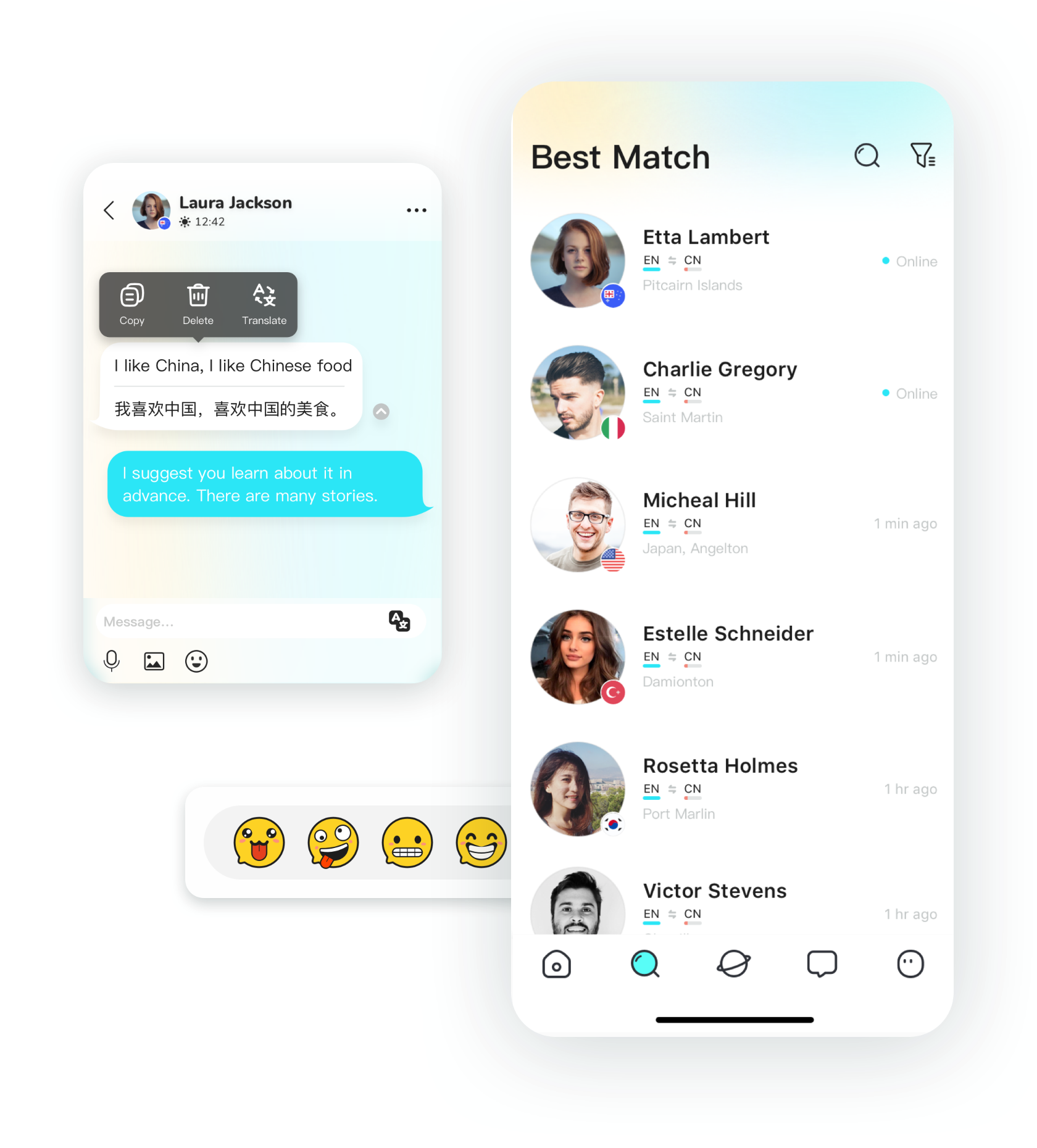 2、根据国籍、语言、爱好自动给你推荐最合适的聊天伙伴,免费无限制的聊天翻译让你和外国朋友聊天轻松无比