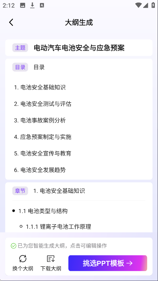 3、生成大纲后,用户可以选择下载大纲,也可以继续挑选PPT模版进行 排版 美化
