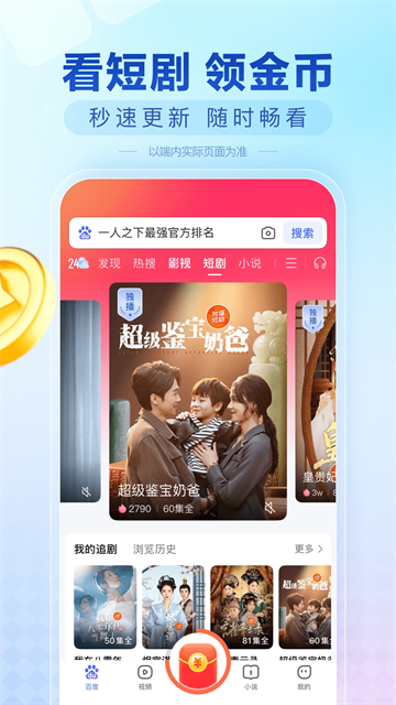 百度极速版最新版是一款超级实用的搜索上网软件,这里的功能是强大的,让你可以在这里浏览搜索各类内容,包括了海量热门的新闻资讯、视频、音乐、明星动态等。让你可以在这里搜索任何所想要查看的内容,同时,你还可以在阅读小说、看视频动漫等。而且软件的页面整洁明了,各项功能都有详细的分类,让你可以从中获得不错的使用体验,操作起来也超快捷的,需要的朋友们,就来这里下载试试吧。