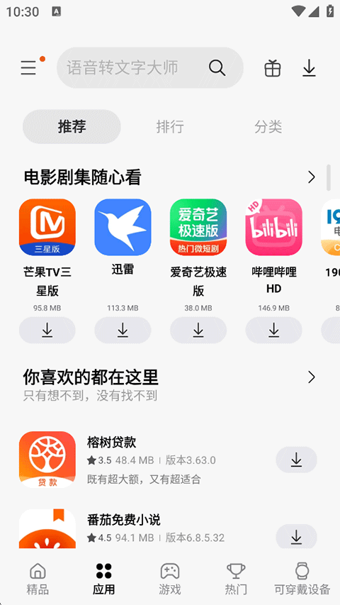 2、应用:系统推荐、下载排行、自动分类,精细化分组让你更快找到好应用,想要的应用;