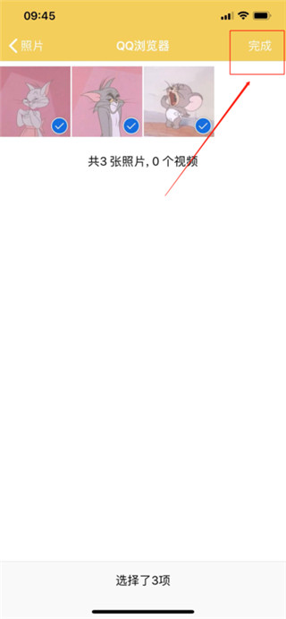 4、进入手机相册界面,将需要打包的照片全部选中,点击“完成”,如下图所示。
