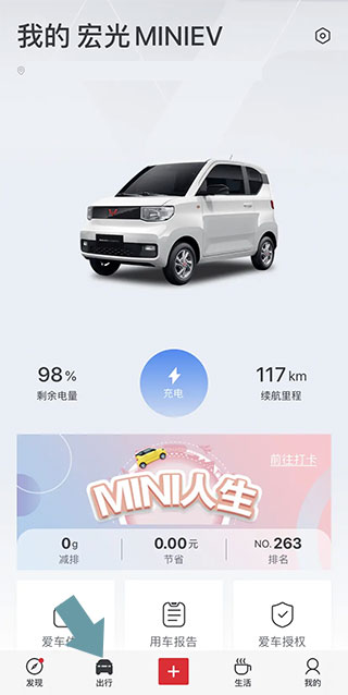 1、想要查看电量前请绑定车辆,然后在主页面点击“出行”。