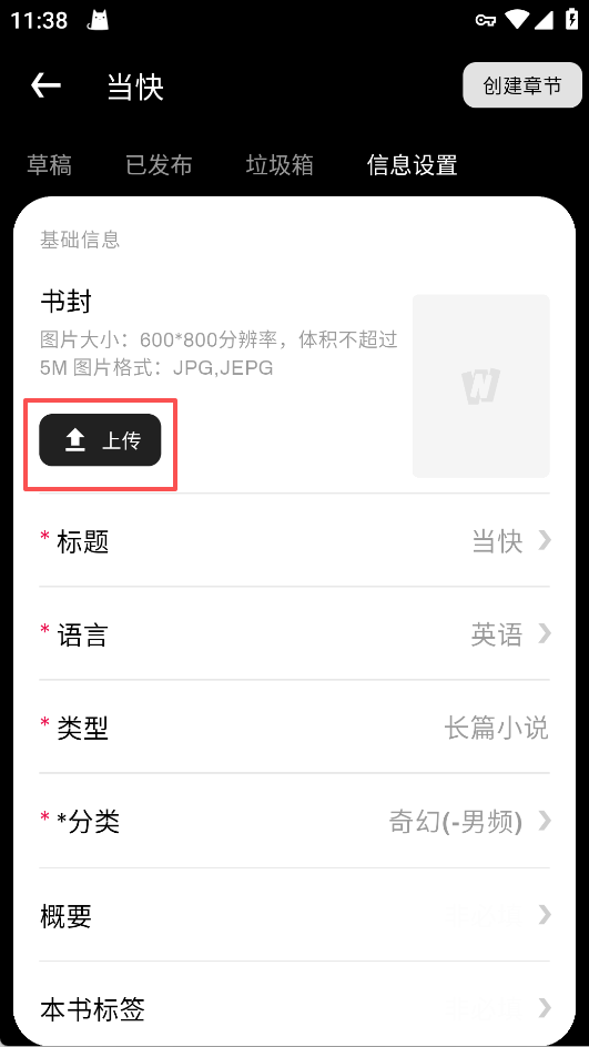 7、上传符合平台要求的封面图片,完善标题、分类等基础设置,完成后持续更新章节并发布作品,即可正式开启小说创作与收益之路。