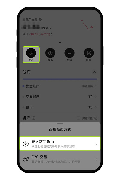 1、打开欧交易所app官方版首页,点击【资产】—【充币】—【充入数字货币】,例如选择币种【USDT】。