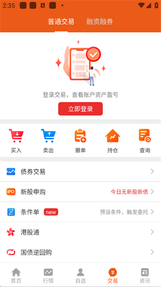 分为普通交易和融资融券,包含买入、卖出、撤单等交易功能及债券交易、新股申购等特色服务。