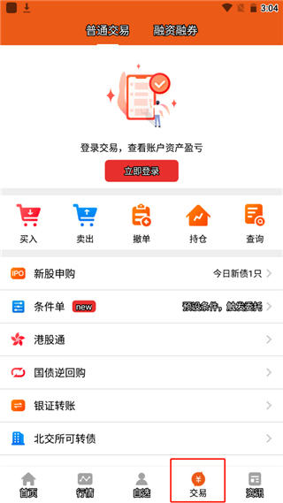 4、点击交易,里面提供了买入、卖出、撤单、持仓、查询、新股申购、国债逆回购等等功能;