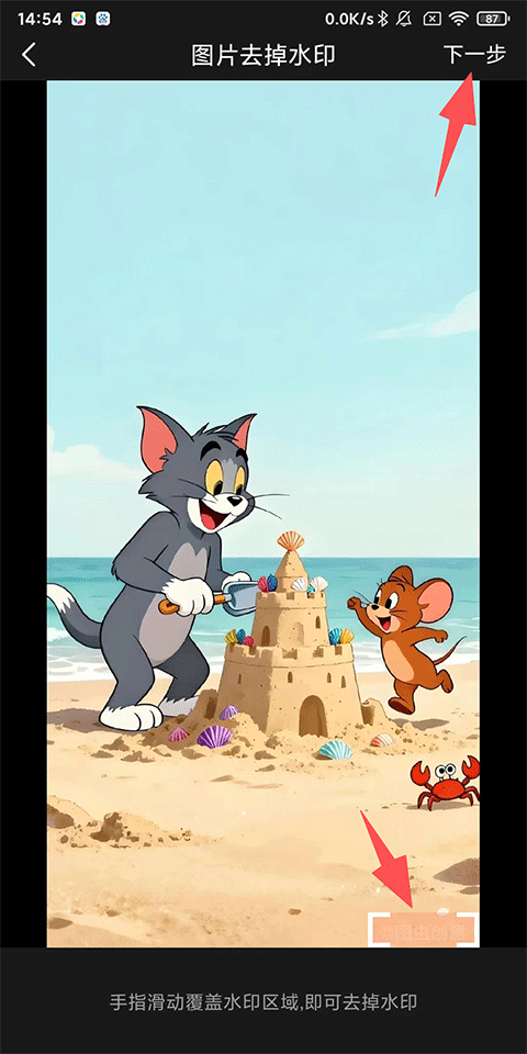 2、导入图片后手指滑动覆盖水印区域,即可去除水印,预览并点击右上角【下一步】;