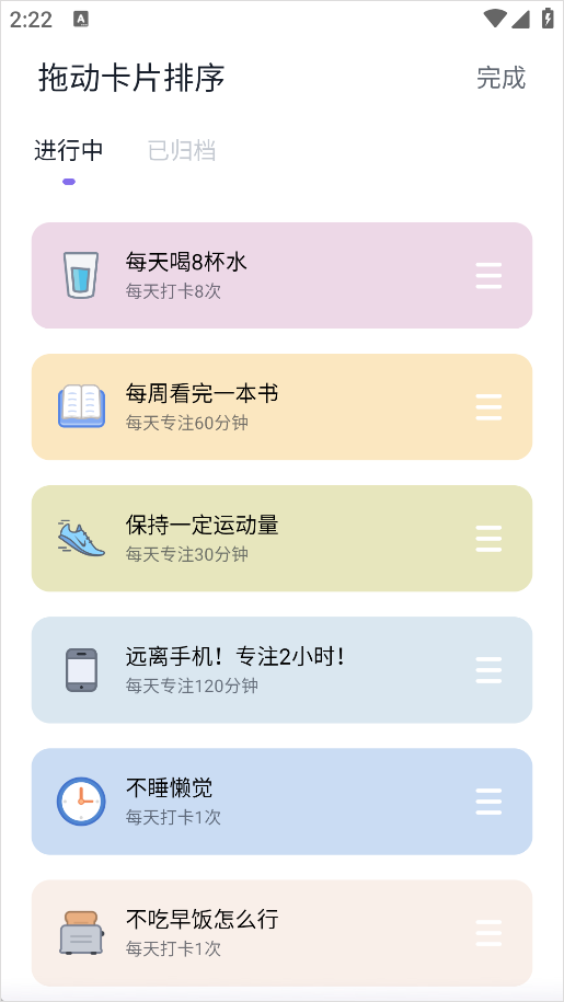 自定义打卡提示:软件提供每日打卡功能,用户可以自定义适合自己的提示信息,这些个性化的提示能够激励用户逐渐克服拖延症,养成良好的生活习惯。